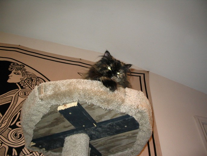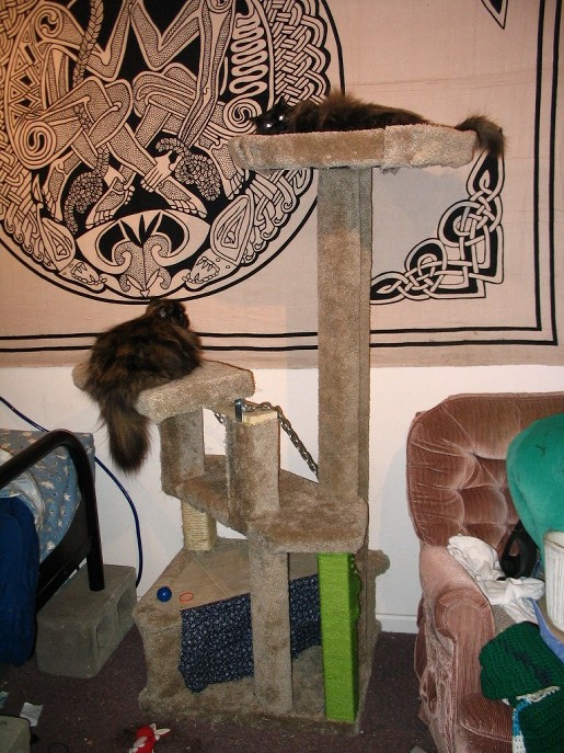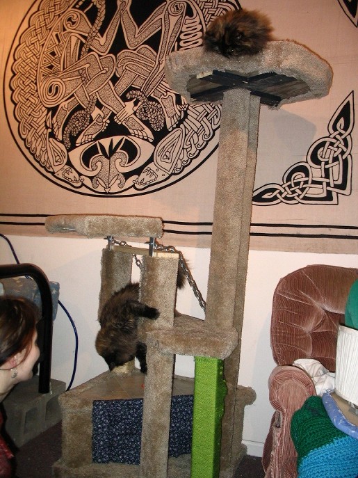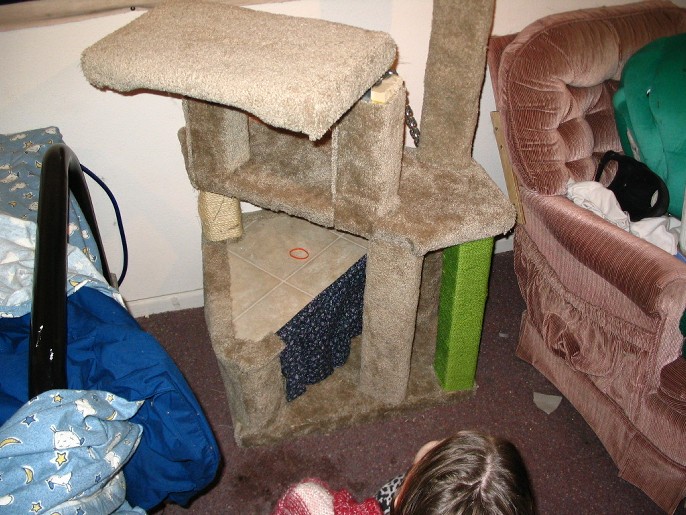 Posted by Seager @ 04:09 AM CST Link | Monday, January 3, 2005 A lot has happened since I last wrote (this is nothing new). My Dad, Sister, Bother in Law, and their 3 kids visited for an extended christmas stay (awesome), as that was ending I got very sick (13 hours on the bathroom floor) followed by Qehn being just as sick the next day. Well, sicker, actually, because she tends to get sicker than me. We blame the Norwalk Virus. It was brutal. It also caused to us have to cut short/skip Ben's visit. Bleck. I also built up Qehn's new computer using Mark's old parts and my old ram. A 1.1g athalon. (beats her old imac) And, I leave to go snowboaring tomorrow on the annual Barker Ski Trip. WEEE!! Yesterday Mark and I finished making a cat tree. We spent about 20+ hours on it over the last few weeks, and made it entirely out of dumpstered wood (old lofts, etc) and dumpstered carpet. The only money spent was on staples for my staple gun. Something like this costs between $200-$400 in a store, so we're pretty proud. Parts of it are a little ricketty, but considering we only had a handsaw and scrap wood, you can't complain. I've included some pictures for your kitty viewing pleasure and... (of course) some video of the cats playing on it, simply because I can. Catless | Both Cats | Both again Cats Playing Video / Tree Tour Y'know there is something wrong with me when I start putting videos of our cats on this thing.